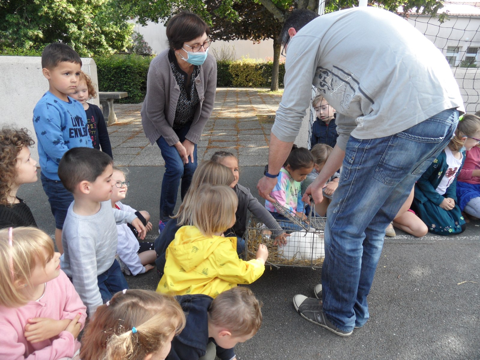 Ce lundi matin 21 juin, nous avons participé à un moment très ludique avec 2 papas agriculteurs ! Le papa de Lubin et le papa de Gabin ont expliqué en quelques mots leur métier. La ferme est “venue à nous”, puisqu’ils ont apporté des petits animaux : une pintade, un lapin et des poules. Nous avons pu les toucher! Enfin, à l’aide de photos, nous avons découvert certains bâtiments de leurs exploitations ainsi que quelques machines. Ils avaient même garé un tracteur sur la cour des grands!
