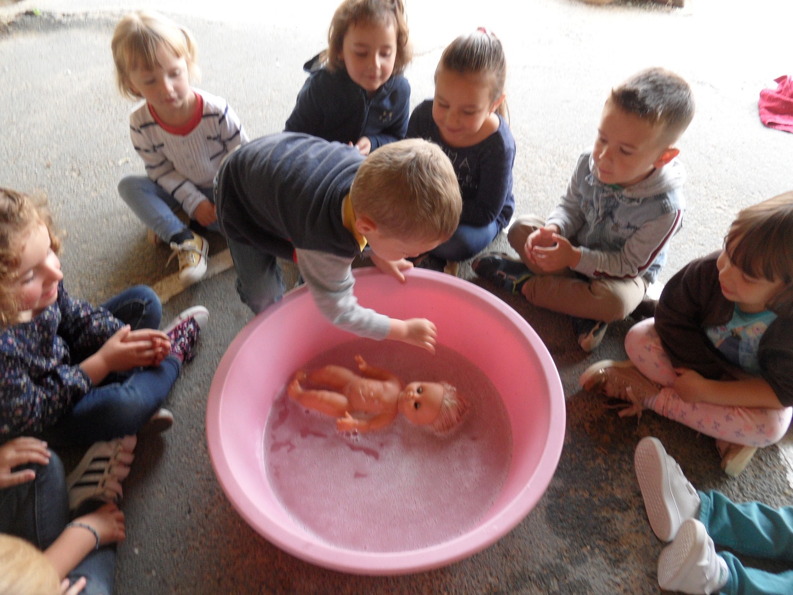 Ce lundi, nous avons également aidé Isabelle à nettoyer quelques puzzles et nous avons donné le bain aux 2 poupées de la classe. Nous avons utilisé beaucoup de vocabulaire : mouiller, savonner, rincer, coiffer, sécher…
